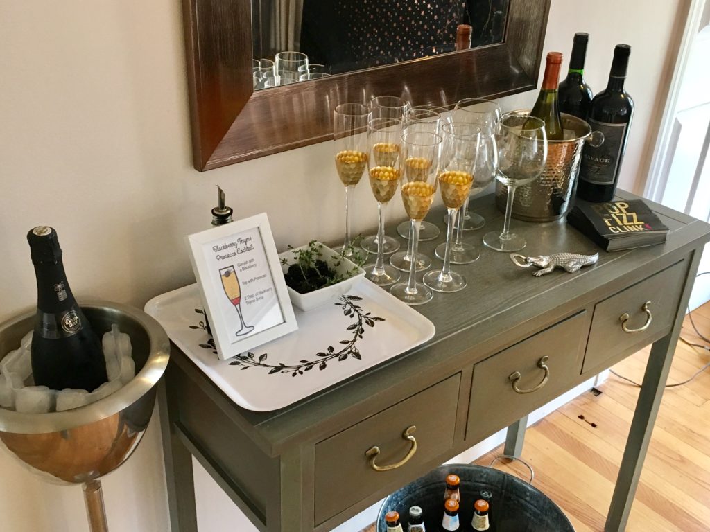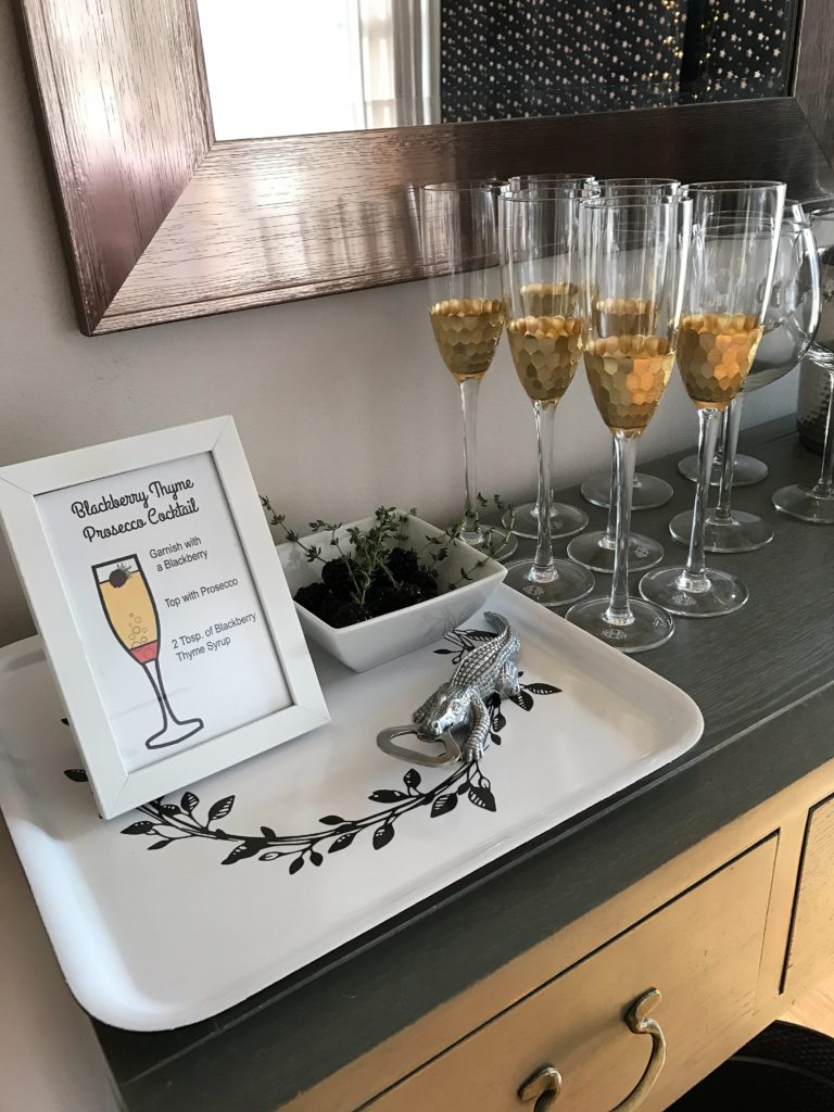 Next I put a little bar area on a table I have in my living room. I like to keep food and drinks in a separate area so it doesn’t get congested in one place, especially since our dining room isn’t that big. Pull out your prettiest glasses, a champagne cocktail, and everything anyone would need to help themselves so you don’t have to worry. For this Blackberry Thyme Prosecco cocktail printable and directions head my previous post. I love using big buckets for cans and bottles but make sure you have a platter or something underneath if its indoors to catch the condensation and not damage your floors.