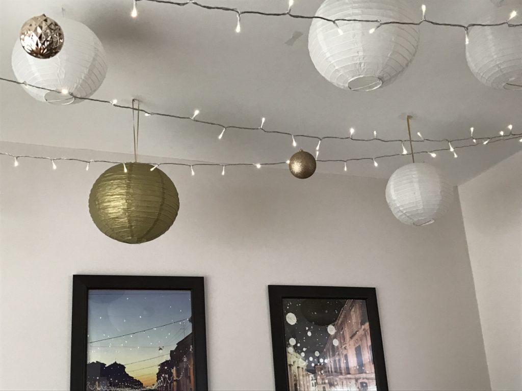 The first was decorating our dining room ceiling with with these LED string lights from Amazon 200 LED Indoor Fairy Lights w/ Remote & Timer on 69ft Clear String (8 Modes, Dimmable, Low Voltage Plug, Warm White) and using command hooks to hold them up. Then I just used good old scotch tape to hold up my plastic Christmas ornaments and these paper lanterns from Amazon Fun Express – Gold Lanterns, 12″ Balloon Lanterns (Includes Wire) (1-Pack of 6).