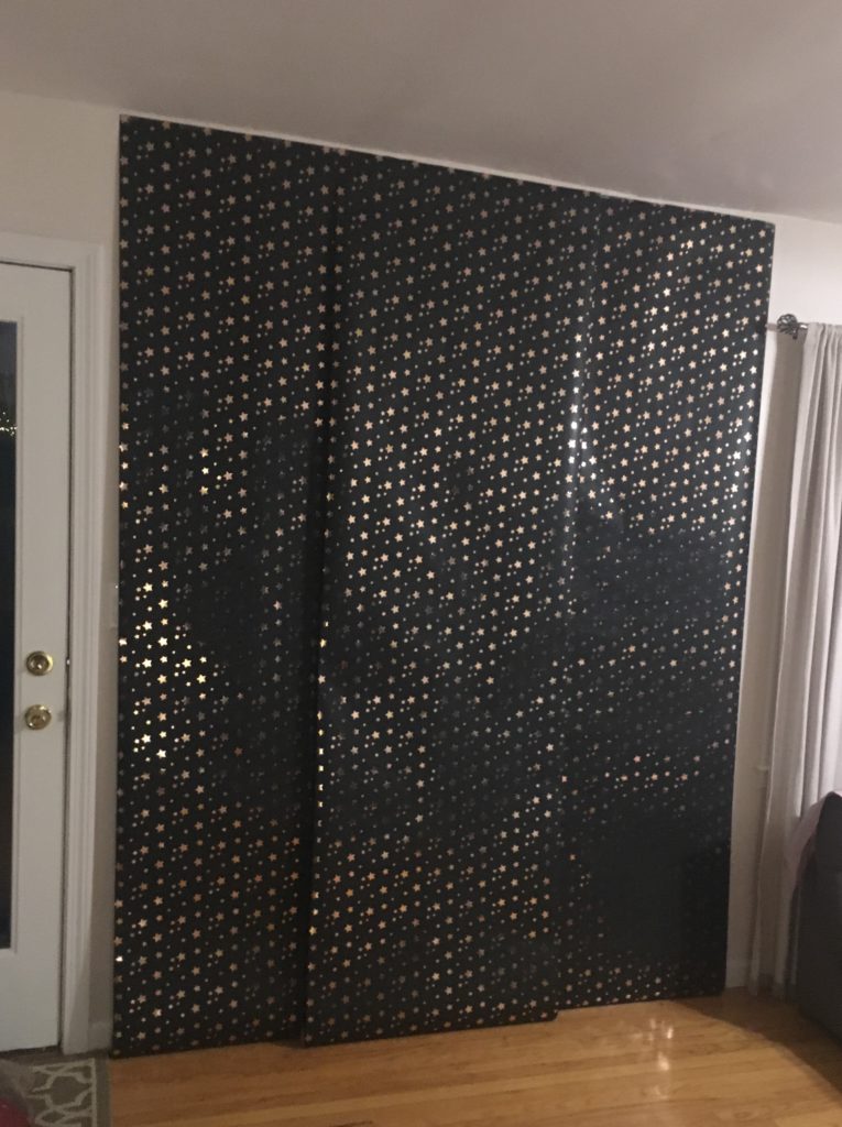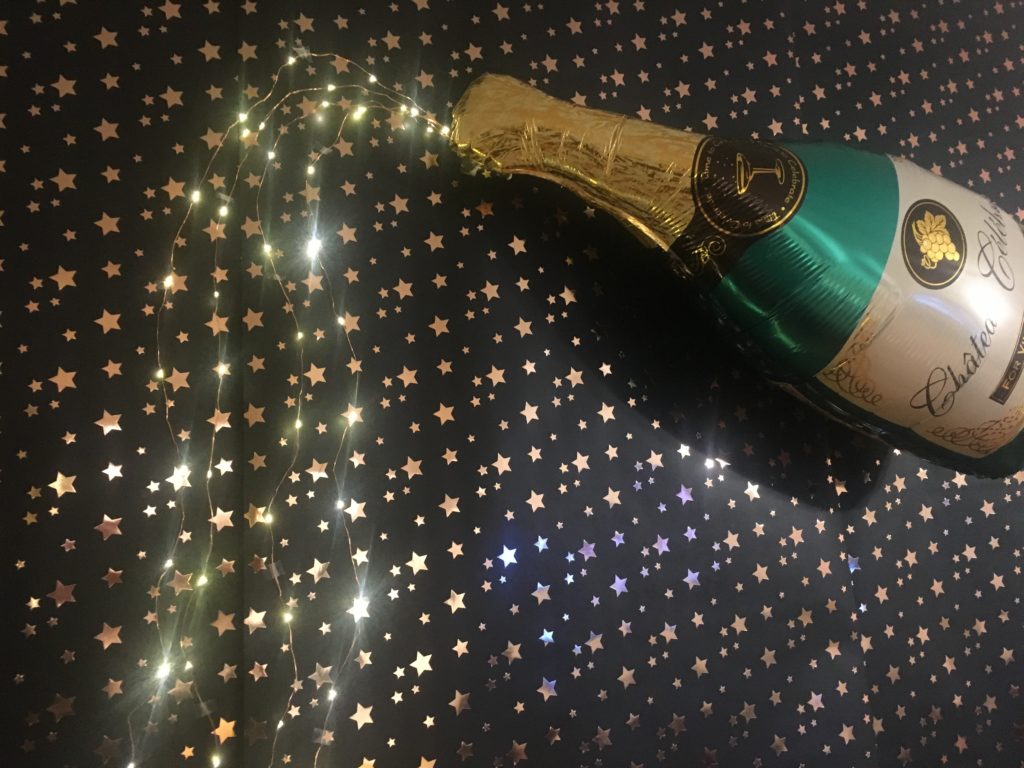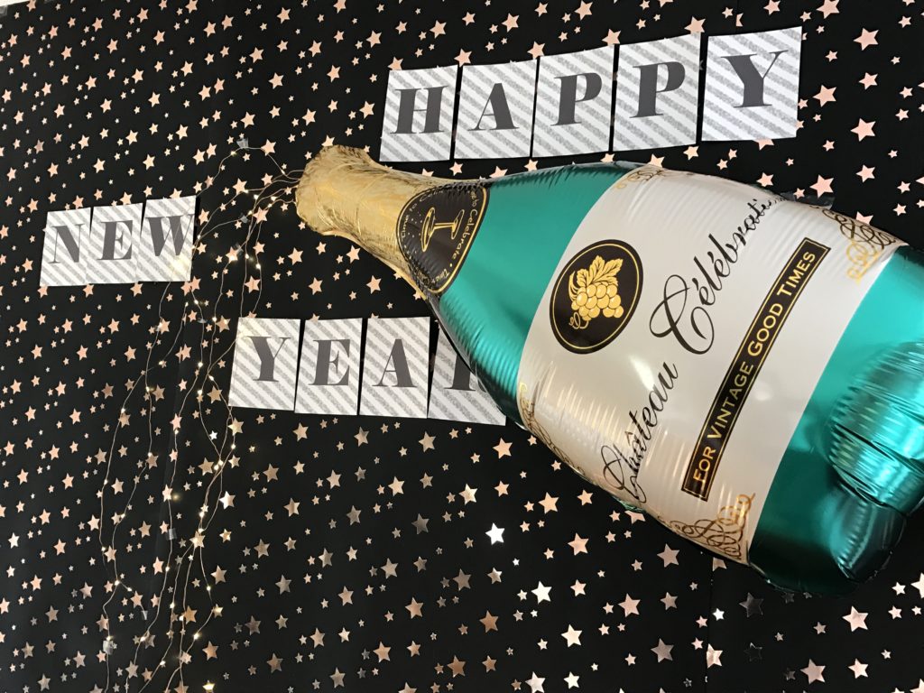 Second was this photo backdrop where I used three rolls of wrapping paper that are taped to the wall at the top and are actually still on the roll at the bottom so I can roll it up and reuse them. Then I added the battery string lights, a printed sign and this balloon from Amazon Fecedy® Aluminum film Champagne Bottle and Goblet Hydrogen Balloons For Party Decoration. A little tape and paper go a long way.
