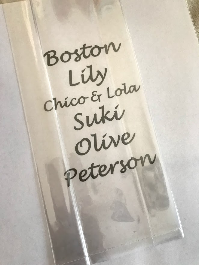 I placed each pot in its only little clear bag to help keep the items in. I purchased a pack of them for a few dollars at Walmart. When it came to the names I actually wrote them on the plastic bag instead off the pot so they could easily be re-purposed. To write them neatly, I simply typed out the names with my computer in the size and font I wanted. Then I just slipped the paper inside the bag and traced on the outside with a sharpie.